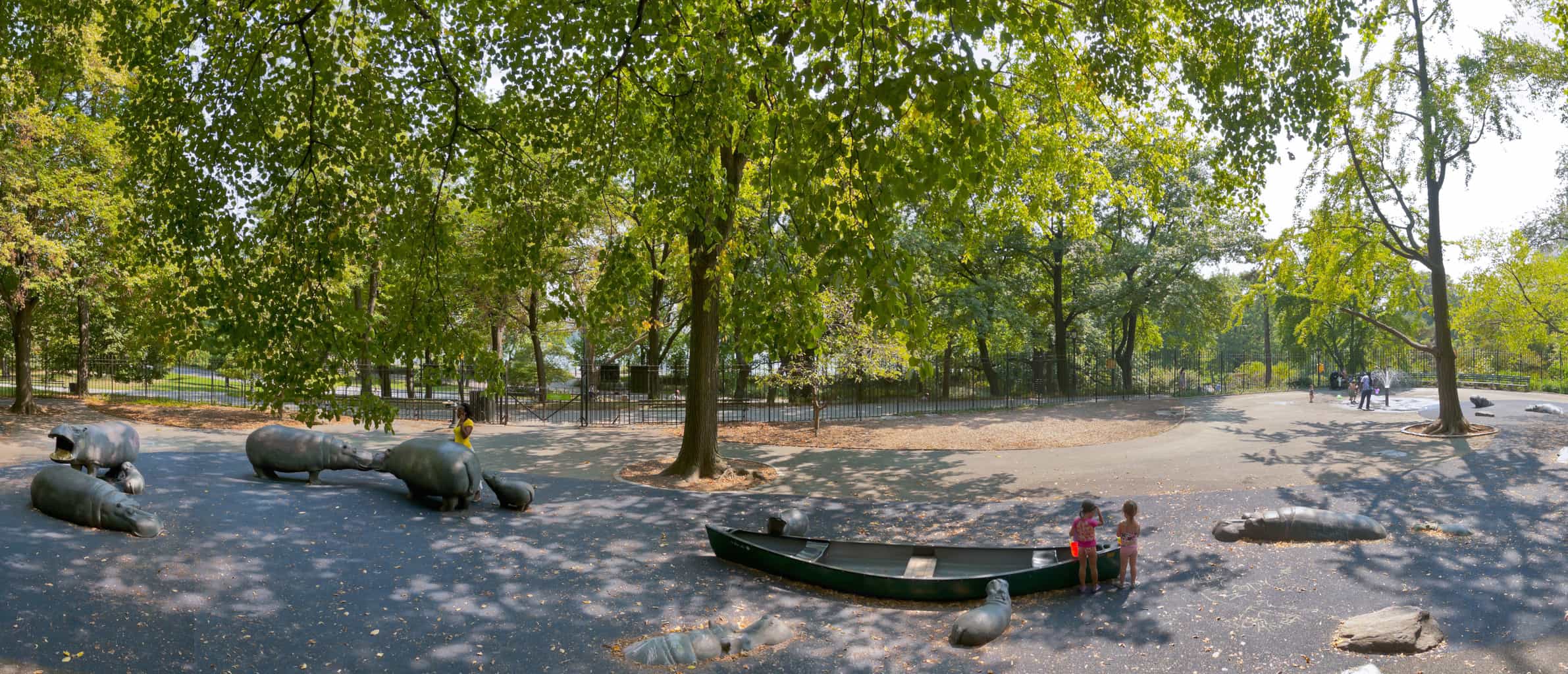 - Honestly, this one’s just about the hippo statues. The playground equipment is fairly standard, including a sprinkler in the summer months and a partially buried canoe (which is inexplicably an often-seen feature in our city’s playgrounds.) But, for the little ones, those hippos are simply amazing. They range in size and in how much of the animal can be seen, with at least one that’s large enough to crawl inside. Lesson: don’t underestimate the power of the hippo as a child attraction.