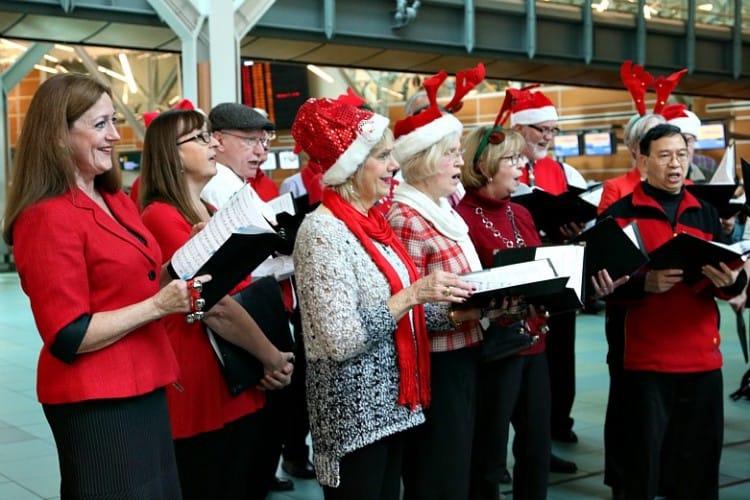 Once we reached 8000 feet on our journey towards the North Pole, kids began to report red flashes outside the plane windows. I scrambled over my seat mate to try and snap a photo for you, but missed my chance. As I went to try again, the plane jolted and the pilot came on the intercom announcing that he had just boarded Santa onto our flight! He was safe and we could bring him back to Vancouver! Additionally…. he made it onto the plane with his huge sack of gifts! I do think that Santa was more excited to meet all of the children on board than the fact that we had rescued him. Coming into an aisle with a big Ho Ho Ho! he spoke to each and every child, parent and sibling, handing each a special gift as we flew. Kids sang carols (and none of the dirty versions, by the way). Air Transat had delivered gorgeous songbooks to every seat. They think of everything.