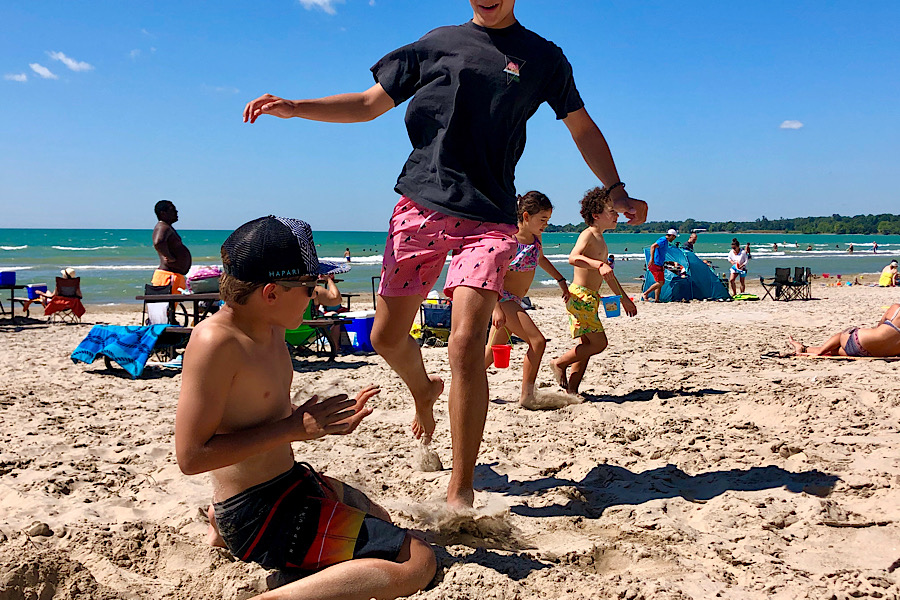 The next morning, the family was up early for breakfast. The hotel has a seated, 4-option menu that was delicious, if not quite a lengthy affair. Closures have made staffing difficult, and with only one chef at the time, it was quite the wait. We were in the beautiful garden, though, and lots of masked kids got up to run and play. Our only concern was getting into the beach at Sandbanks Provincial Park before it was full.