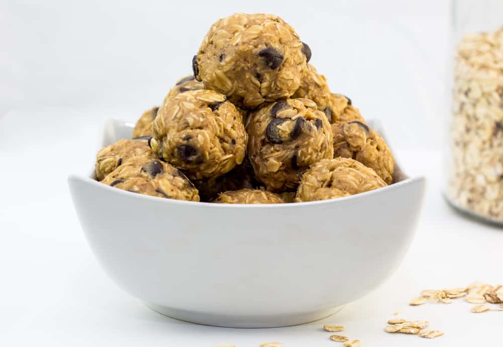 - Protein Energy Balls (1 1/2 cups rolled oats, 1/2 cup vanilla protein powder, 1/2 tsp cinnamon, 1 T chia seeds, 1/2 cup smooth natural peanut butter, 3 T natural honey, 1 tsp vanilla extract, 1/3 cup raisins or chocolate chips, 3 T almond milk)