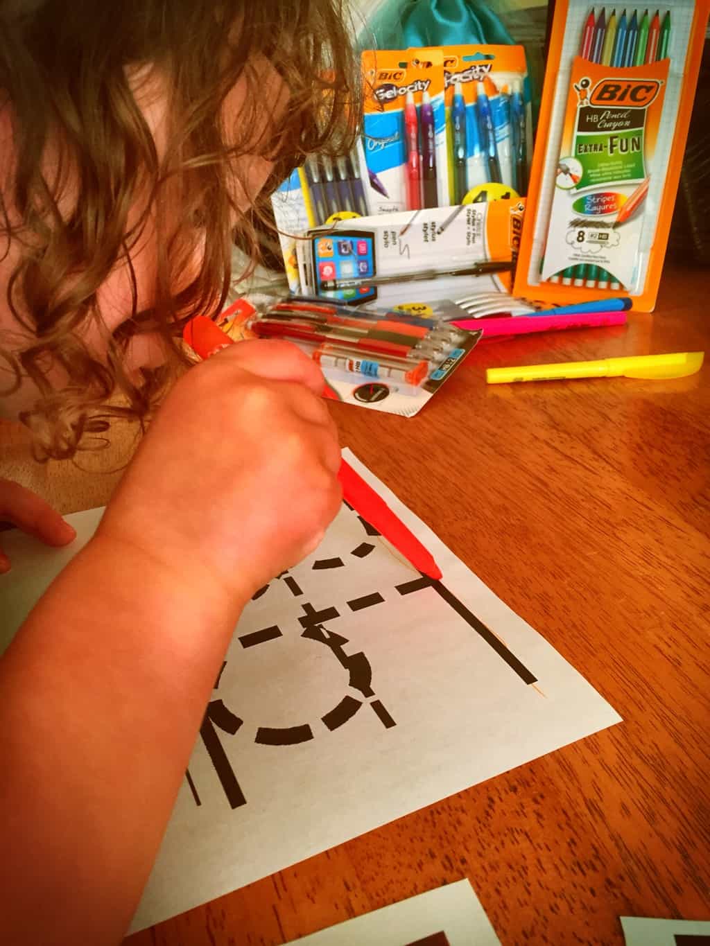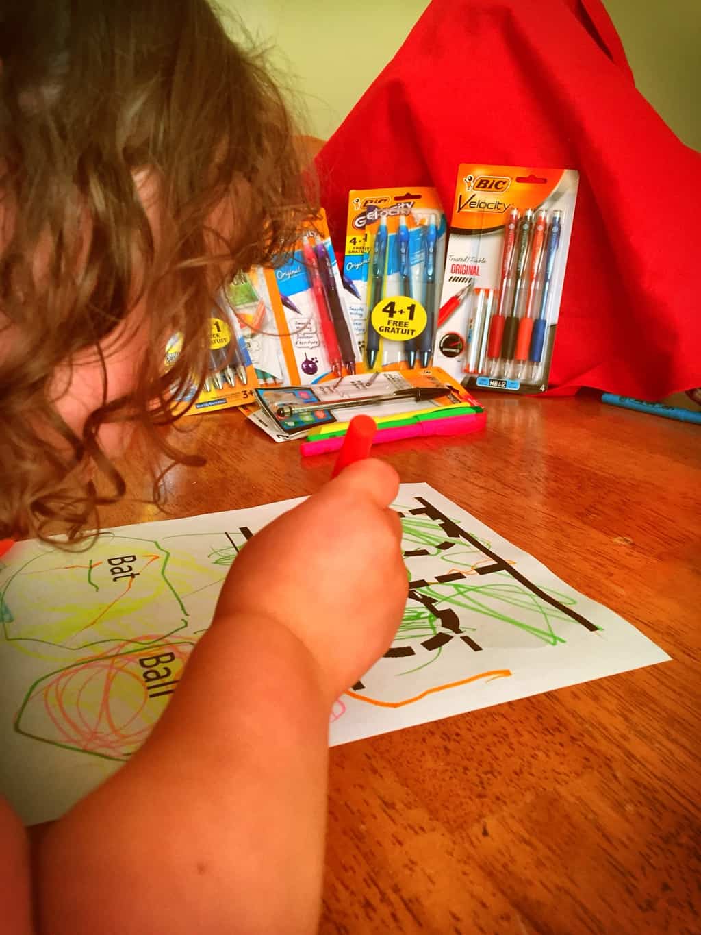 Now, my toddler is like most toddlers, that is to say, her attention span is slightly larger than a gnat’s so keeping her focused is always a challenge. Fortunately, she loves to colour and she knows the alphabet, so adding some letter recognition activities to colouring was a natural path. To add some serious awesomeness to our project, the good people at Bic decided to help me out on this journey, and sent us a box of cool stuff to try out!