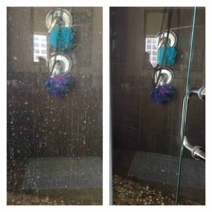 I was skeptical. Maybe essential oils can be used topically to help alleviate a sore muscle, headaches, or oncoming colds. Maybe they really do improve your mood, and kill it at eliminating the funky smell in your garbage disposal, but two months worth of soap scum? No way. Even a pressure washer couldn’t chip this stuff off. If this soap residue had been etched into the glass, it would’ve be easier to remove. Of course, we all get to a point when we’ve given up so much hope that we’ll try anything. So, I did. I filled a large glass bowl full of hot water. I added six drops of Thieves oil and ten drops of lemon oil. I stepped into my shower and started wiping the glass with a washcloth. This is what happened: