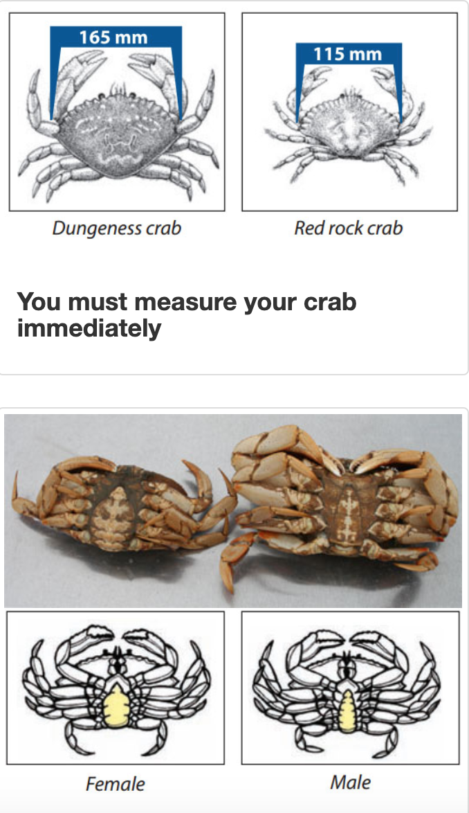 Adhering to the Canadian guidelines on crabbing is critical. First, grab a license online. As a rule, all Dungeness and red rock females are thrown back. The males must be 165mm wide if they are Dungeness, and 115mm for red rock. They must be measured immediately, and then throw back the undersized ones.