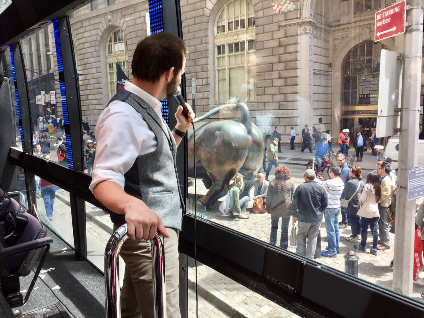 I’m getting ahead of things again. The experience really begins before you ever get on the bus, when you meet up with your guide. Actually, let’s call him the storyteller. You see, this really isn’t a tour at all. The Downtown Experience is as a unique blend of theater, mixed with a multi-media museum exhibit. The Storyteller weaves the original narratives of historical fiction with a bit of improv and drizzles it over the backdrop of modern day New York.