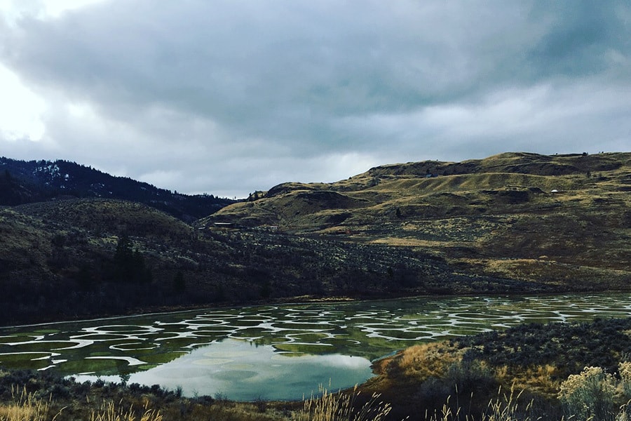 Back on the road heading for our lunch reservation, we made a quick pit stop at Spotted Lake, the perfect place for a photo opp. Originally known to the First Nations of the Okanagan Valley as Kliluk, Spotted Lake is richly concentrated with various minerals thus thought to provide therapeutic waters. Most of the water in the lake evaporates over the summer, revealing colourful mineral deposits.