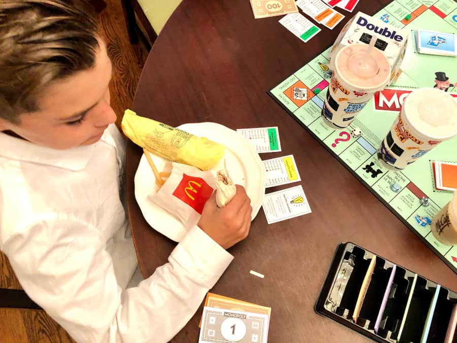 One son likes chicken, the other beef. Chocolate shakes for the boys and Coke Zero for my husband. To delight the lot of them with me in the kitchen would take hours. Usually I try to get the amazing grilled chicken salad and an iced coffee, but lately I’m also on a cheeseburger kick! We all order exactly what we want and there is not a scrap of wasted food – just time together as we anticipate the ring of the doorbell before our family adventures ensue. This week we played the Monopoly board game and also added a few more pieces to our McDonald’s contest game boards. The McDonald’s Monopoly game is on until November 11th so there is still time!