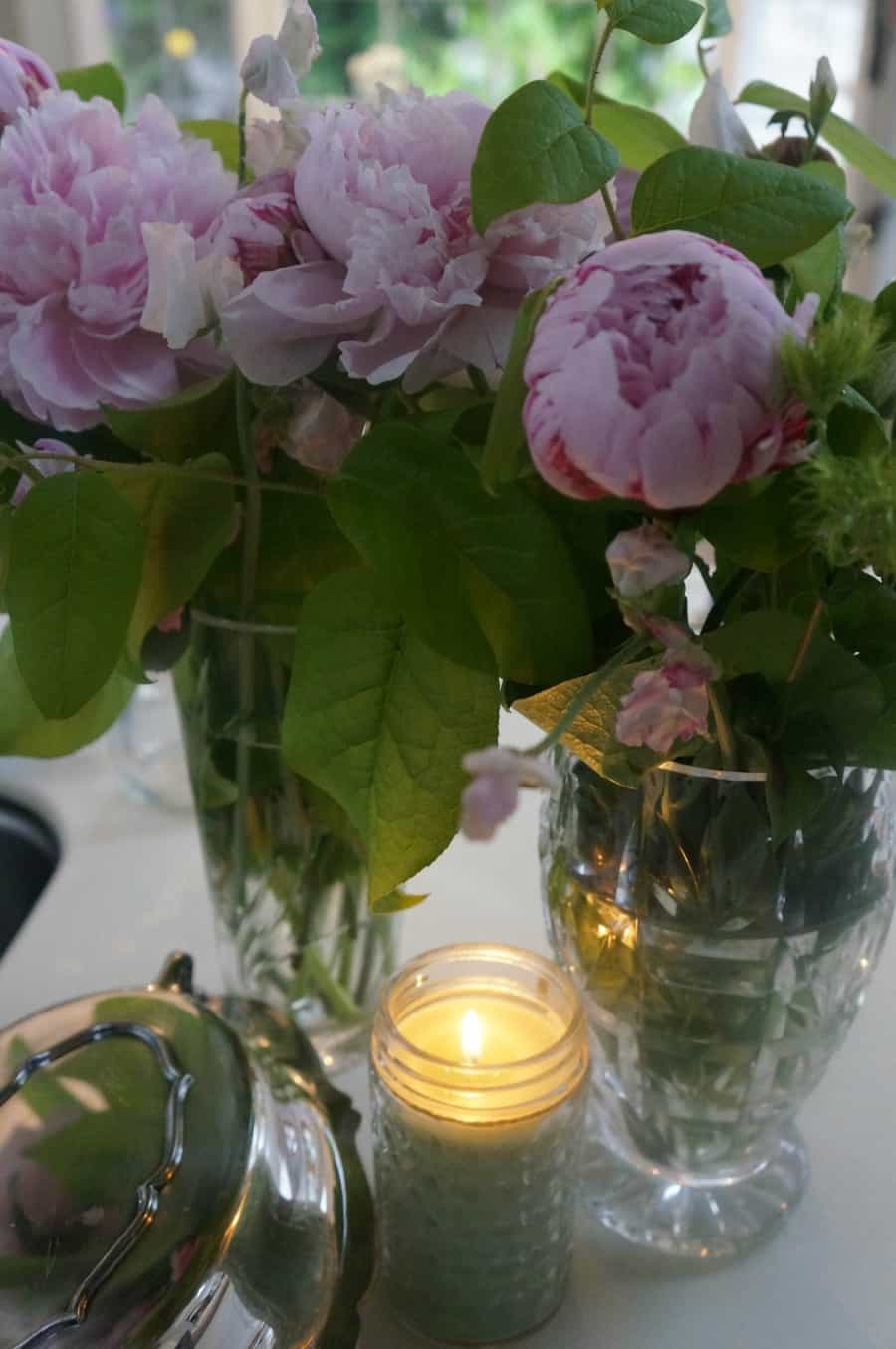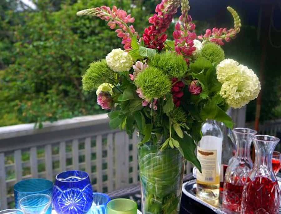 - Wrapping stems in the vase with one or two thick leaves covers them and fills out the vase so it looks like a solid colour. Here’s an example from a spring party at which I should have served pizza!
