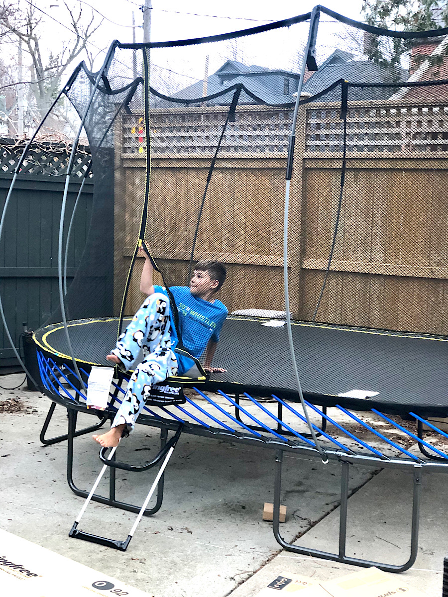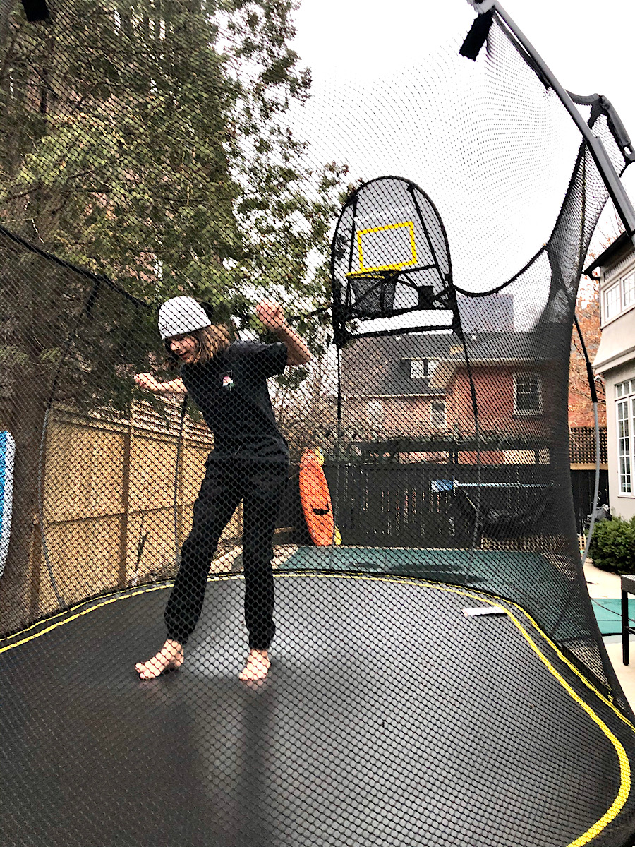 Fast forward to early 2020 when we are whisked home from what was meant to be a vacation in warmer climates and the cloak of COVID-19 blackened the world. All of a sudden the kids were not pining for our life in Vancouver anymore. They couldn’t go to the park, see friends or shoot hoops at the local public school. Yet even not being able to socialize, they had a certain acceptance that everything had changed. Everything was different and all of the broccoli on their plate was getting eaten. Early in the fall I was asked to work with Springtree Trampoline once again and we knew that when the weather got warmer, a trampoline would be added to our small yard. It was worth taking up all of the outside space, though, because at the time I had decided this is what the kids needed to adjust to their new life.