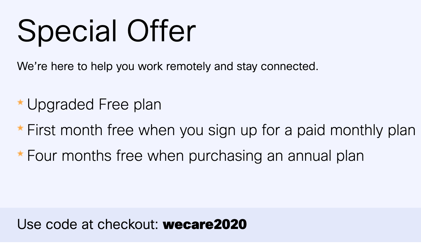 This is one of the only companies I’ve found who added more bulk into the free plan during this crisis. There is also code below for a discount on the paid plans as well. WebEx allows you to integrate with the apps you love like Google Drive and Office 365, so your work remains connected. It’s geared more to professionals that education or wine with girlfriends but also worth a good look.
