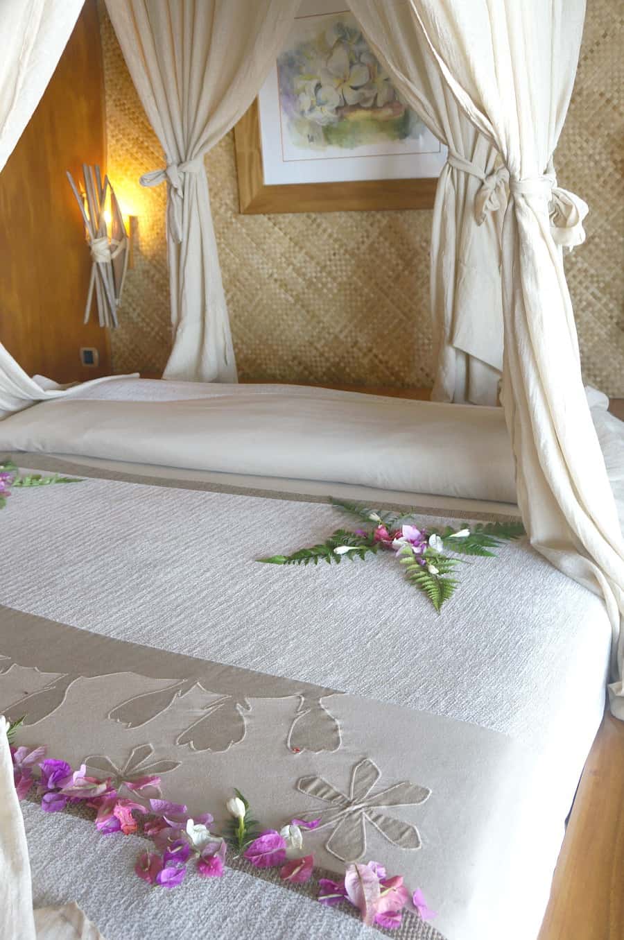 After a 35-minute pre-arranged journey from Raitea airport, we began to pass quaint buildings including a majestic yet simple chapel. Taha’a is part of the Society Islands, and shares a lagoon with the much larger island of Raitea. From the channel, you can catch a glimpse of Bora Bora in the background. We arrived at the Tahaa dock and were presented with handmade leis. I had never smelled the Tiare flower in life – only in expensive perfumes. It was a scent I would become familiar with as I strolled the grounds, and it is so delicate that I would have done anything imaginable to preserve my necklace for days! The entire grounds were covered in flowers and old trees – a priority of the resort’s owners.