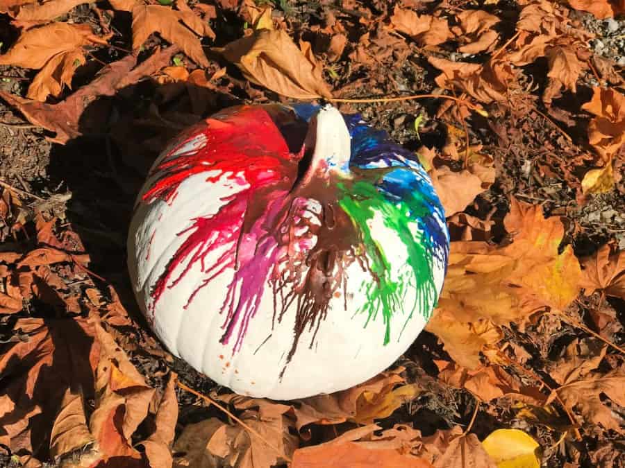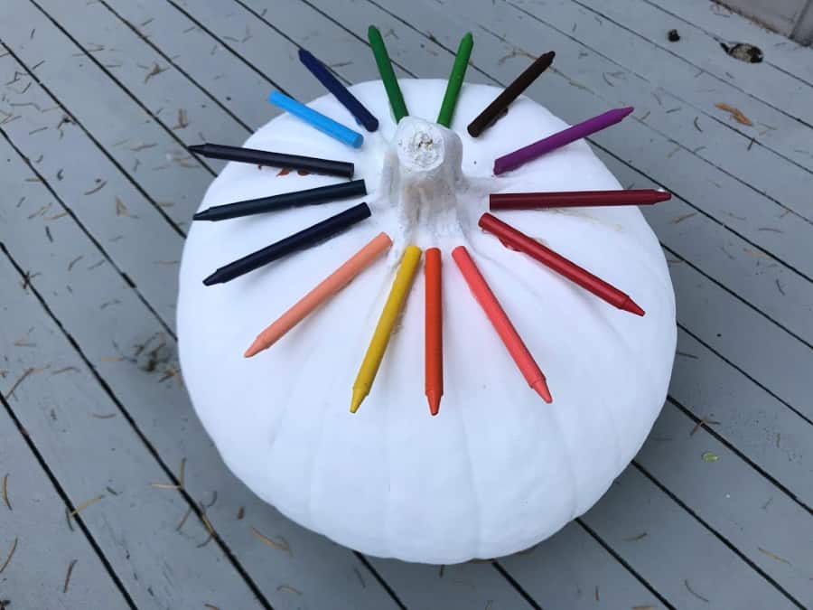 This one is so fun and very easy. First, paint the pumpkin white for a good base. Use your glue gun to glue a rainbow of crayons to the stem area of your pumpkin.