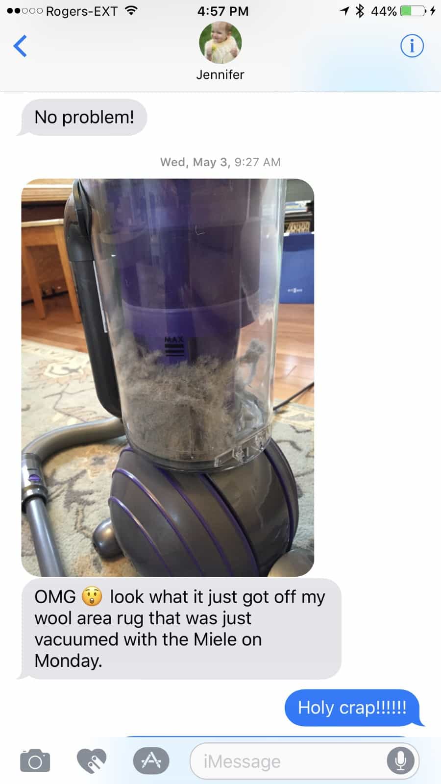 The best part about this campaign is that I have also been given a chance to play the cleaning gods forward, and give a second unit to a friend to test. I chose a friend who had never owned a Dyson and is twice as meticulous about cleaning as I am. Her house is always spotless (despite having 2 kids and a dog) and she’s also the friend who cooks with agave and feeds her girls the healthiest meals ever. She puts me to shame, really. And there is no better person to truly test the Dyson Ball Animal 2. She immediately drove it home, set it up and started cleaning. Within 30 minutes I had the following texts: