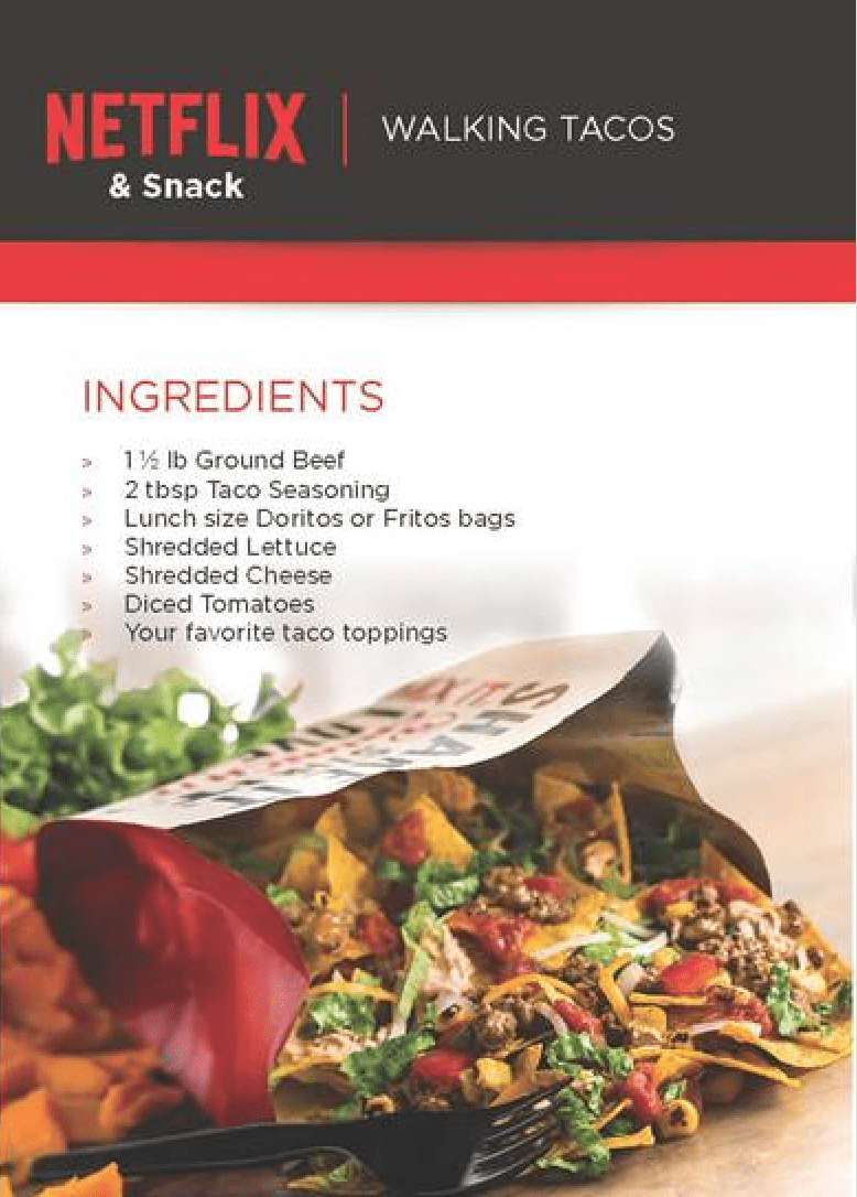 This month Netflix surprised me and totally came to my rescue. Being part of their stream team definitely has it’s perks, and this month they had a recipe for Walking Tacos with their September email. This was a meal I could totally see my boys devouring! I mean, what’s not to love about a deconstructed taco served in a bag of Doritos for school aged boys? There’s something about eating out a bag that is an easy sell to boys, and most kids in general. Paired with a favorite show on Netflix it’s got to be about the most idyllic way to pass the time between activities and school.