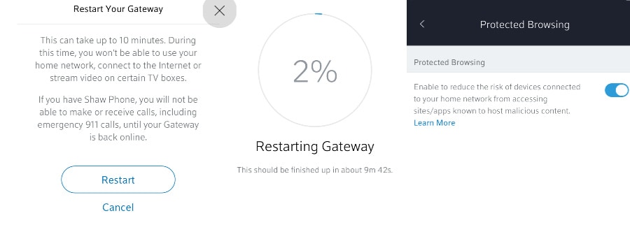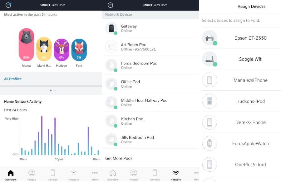 Not only does every family member get a profile that lists all of their devices, but the option of pausing or setting bedtime limits for individual devices is super handy. You can set a limit for a specific gaming unit within the basket of devices under their profile. You see a percentage of usage for each family member as well as the times of day that happen to carry heavier usage. The app also allows you to restart the Shaw BlueCurve Gateway modem remotely without searching for a little pin and climbing up to the modem to do it manually.