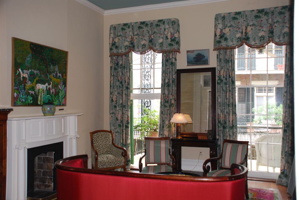 Rooms are all unique, and our suite was breathtaking. A hallway with a crystal chandelier, king canopy bed draped in lace, and.. oooh.. that ruby red silk sofa. Sitting on it was a sacred experience. The traditional windows slid up, revealing a balcony graced with wicker that overlooked Chartres Street. Gracious sliding doors separated the bedroom from the sitting room, and if the city of New Orleans hadn’t been so fabulous, I would have stayed in the room all day. I did do a mini-excursion to the antique shops nearby and found incredible mardi gras costumes (including a 20 foot silk cape handpainted with Jack and the Beanstock motifs). Of course I bought it. Did you really wonder? The room was the perfect setting to model my finds for my husband.