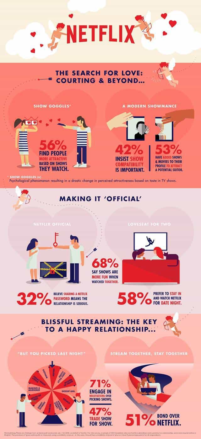 - Staying in is the New Date Night. Six in ten (58%) respondents in a relationship say they prefer to stay in and watch Netflix for date night. Most (77%) say they watch Netflix together because they like spending time together without leaving the house, while seven in ten (68%) say shows are more fun when watched together, and 58% enjoy having someone to talk with about the show – the ultimate bonding experience!