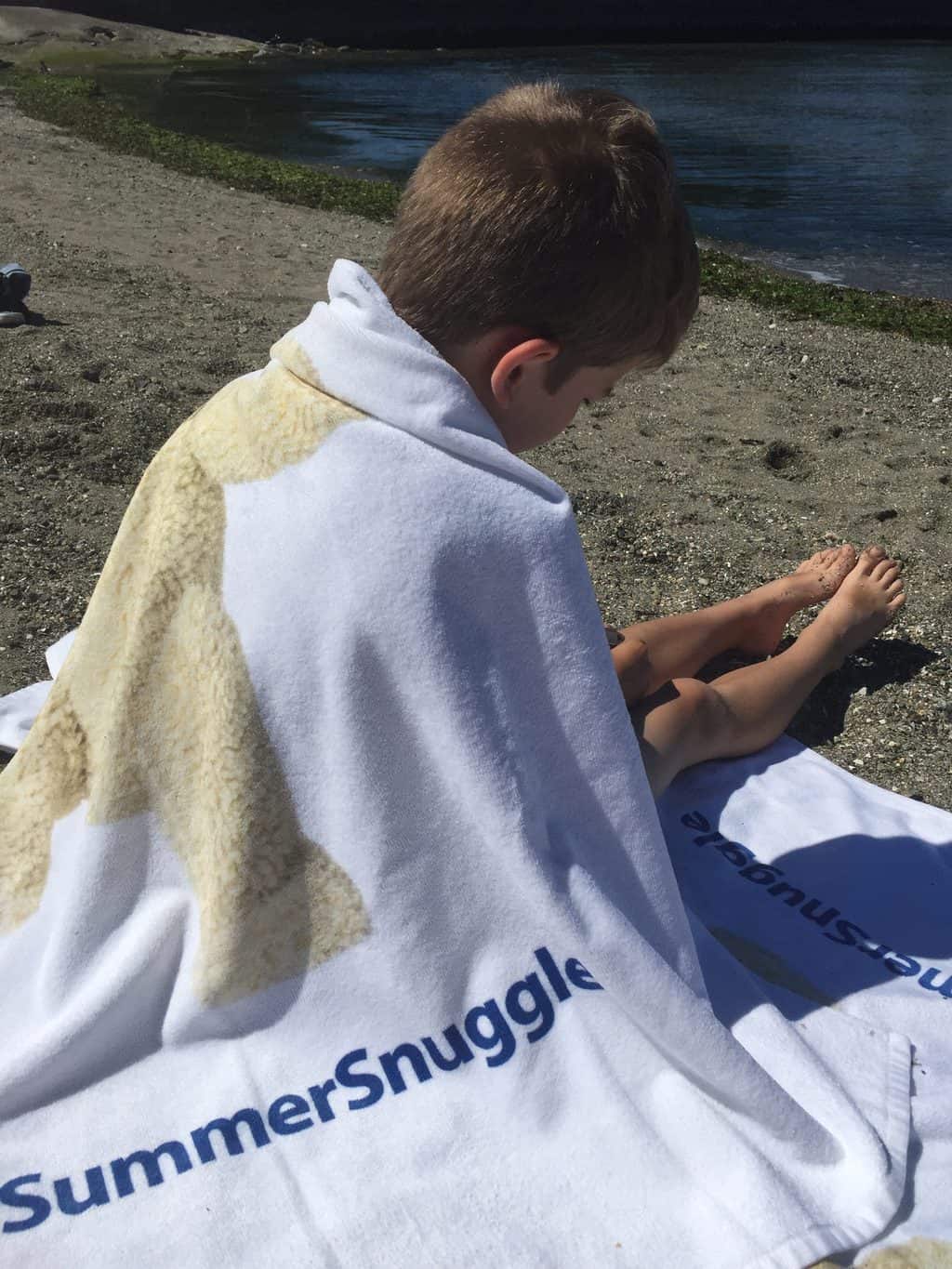 I spent time growing up in the Okanagan, so I was fortunate to enjoy many summer days at the beach. My happiest memories are sun-drenched and sandy! Stretching out on a beach towel to enjoy the sunshine, or sitting on one while building sandcastles, is such a great sensory memory.The softness of the towel fibres on my skin contrasted against the roughness of the sand at my feet is ingrained in my mind with its textures and sensation. As a mom, I want my son to have those kinds of warm, happy memories of carefree time spent at the beach as well.