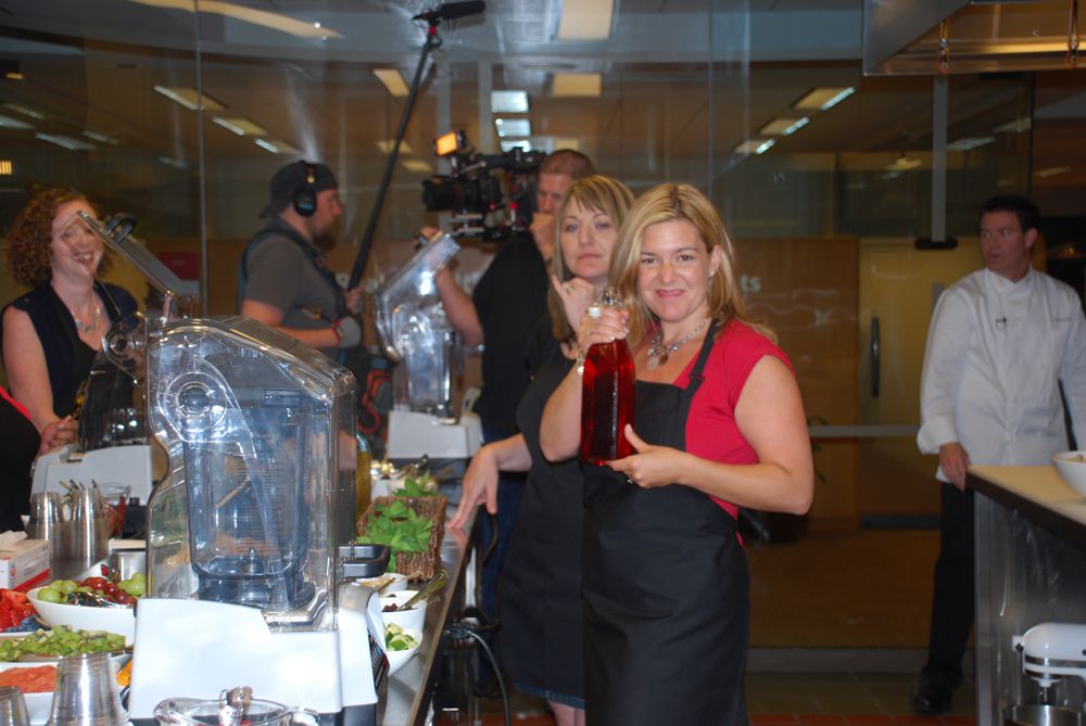 When in Chicago at McDonald’s head office, we met with Chef Dan and were given quite a lesson in how menu items are developed. Remember that TV show ‘Just Like Mom’ (damn sexist title) where kids made different foods with a variety of crazy ingredients? Same goes here. Tenille (from Feisty, Frugal and Fabulous) and I had bunches of fresh fruits, veggies, yoghurt, juices and grains and were charged with creating a smoothie. Being the health-consious gourmands that we are, we decided to camoflauge beets and spinach with yummy dark purple fruit. Move over Jessica Seinfeld. Here’s the lowdown: