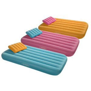 My 8 year-old daughter is begging me for a bed that can accommodate all her friends when they have a sleep over. Rather than pull out the old sleeper sofa’s mattress, we elected to go the less time consuming and affordable route and took a look at the Cozy Kidz Airbeds. The Intex Cozy Kid Air Bed Twin Size comes in three bright fun colors: pink, blue and orange . Both the pillow-top and mattress-top are lightly flocked which adds comfort while also preventing the sheets from sliding off of the mattress. This is the perfect air mattress to take on a sleepover or even family camping trips. The beds are 34.5″ Wide x 62″ Long x 7″ height (slightly shorter than the average twin bed) but the dimensions may vary up to two inches depending on firmness and come with built in pillows. Even better? The mattresses can withstand more than 200lbs which means more than one child can sit on it at a time before having to worry that they are going to cause the mattress to deflate. One note, the mattress does not come with a built in pump.