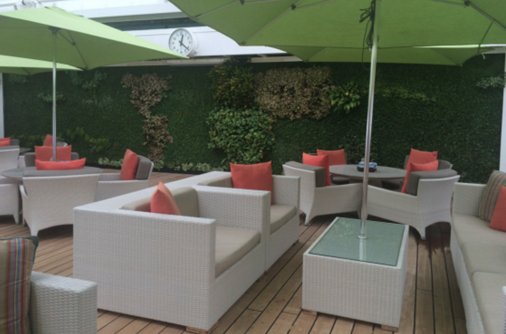 Trident Bar and GrillThe bright Trident Bar and Grill speckled with lime green umbrellas and orange cushions featured a living wall in the shape of the earth.