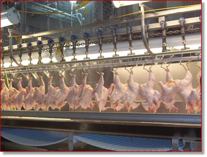 In the slaughter area, everyone was so calm and peaceful I didn’t know where I was until it was pointed out to me. It wasn’t what I was expecting. It was very dark, with a blue light shining. As per Temple Grandin’s recommendations on animal welfare (link to beef post), the facility has been audited and Temple Grandin has approved of the process itself. In addition, blue lights are used because birds can’t see the colour blue so it appears dark. They are hung by the ankles, a plate or bar rubs the breast of the bird and they hang touching each other, shoulder to shoulder. I witnessed first-hand how calm this makes the birds. They are not flapping or making noise. They travel on a rounded track and are dipped quickly in water where an electrical stun renders the chicken insensible to pain, which means they are unconscious and alive but do not feel any pain. Their necks are cut and the bleed-out occurs while the chicken is unconscious so they are dead before they wake.