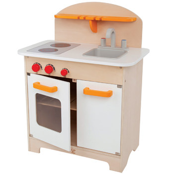 The Educo Gourmet Chef’s Kitchen is a wooden option to inspire little ones to earn their Michelin stars. The realistic knobs make clicking sounds and kids can check on what is ‘baking’ through the oven window. Be warned: it’s a top seller you’ll want to order early. $140
