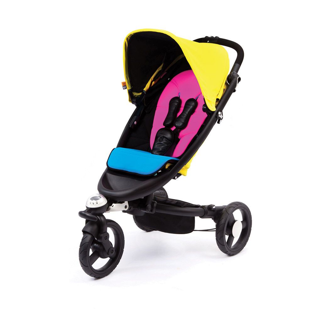 This stylish, brightly colored stroller features a detachable bassinet, adjustable handle, and four swivel wheels. The suspension is also adjustable and creates smooth strolling.