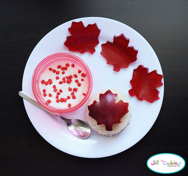 3. Maple leaf jello jigglers on a sandwich with sprinkled yoghurt from Meet the Dubiens.