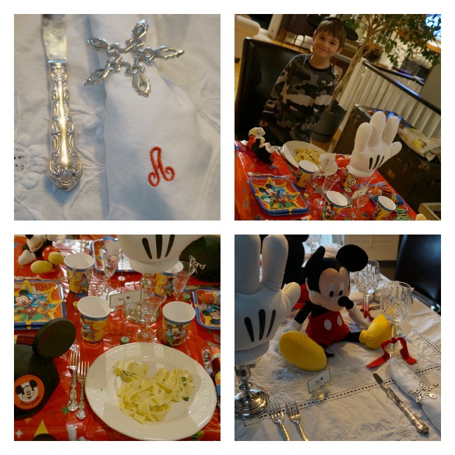We set our celebration with eight adults and four children. The adult table was formal with crystal, linen and silver. Kids had many Disney inspired stuffies and themed napkins. I had the kids type names for place card adorned with Mickey Mouse faces and glue them to thick cards edged in black. The kids learned how to properly set a table and they were given ‘wine’ glasses for their Monsters Inc. juice.