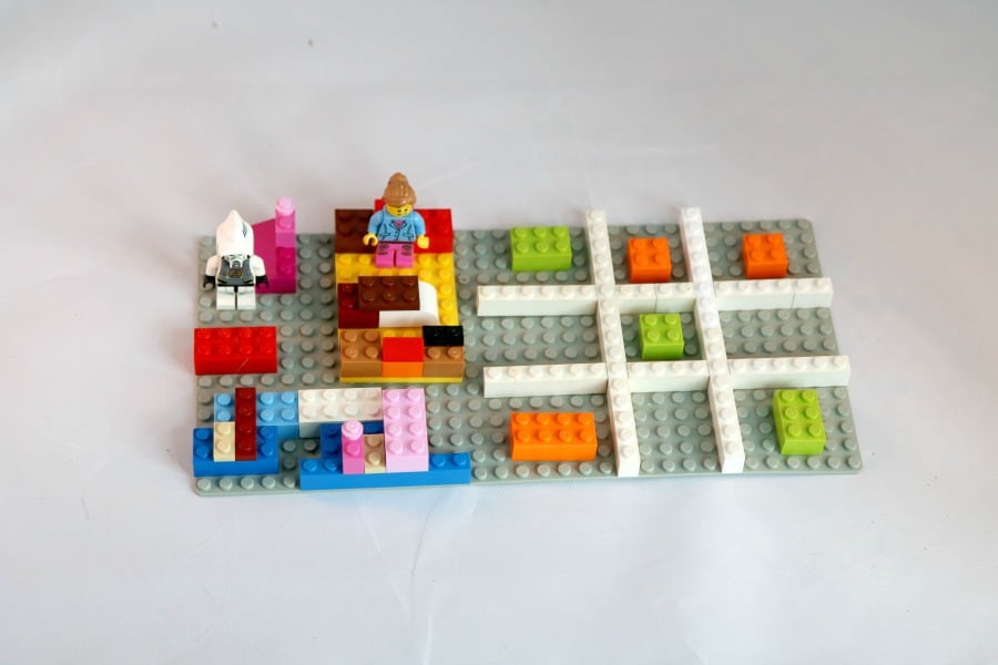 8. You don’t need oodles of Lego to be creative. Making a Tic tac toe grid on a lego sheet with lots of building pieces and people is a great space-saver.