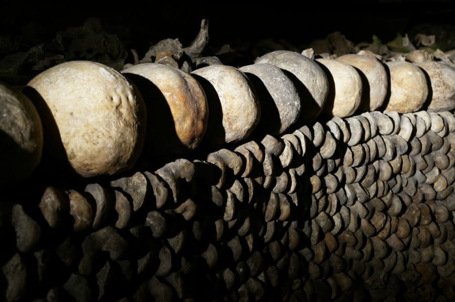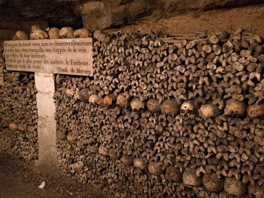 The patterns of bones are artistically assembled to maximize space and pay homage to the dead. Femers on the bottom, followed by arms and skulls. The bones were not always organized, and at the beginning were just strewn anywhere. Around 1810, Hericart de Thury, the inspector of the quarries, had the bones organized.