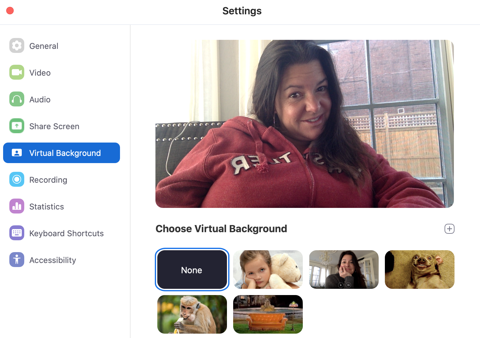When you are active in a Zoom video call, got to settings. You will find it under the Zoom.us tab. Select Preferences, and then Virtual Background. You should see your face on video at the top of the screen, and then beside ‘Virtual Background Image’, there is a ‘+’ sign.
