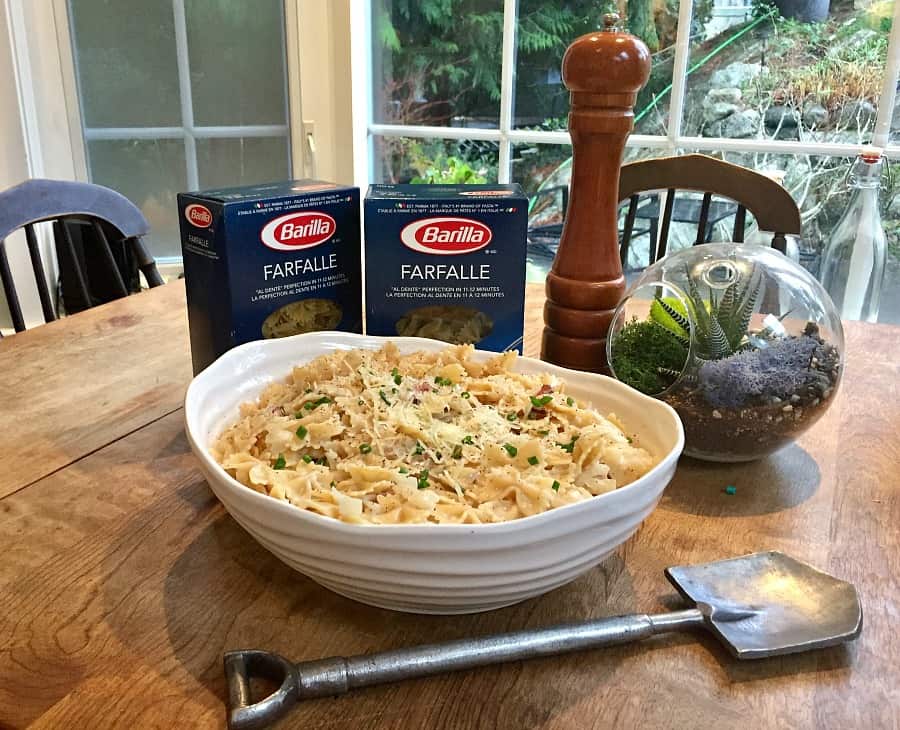 Yeah, no. We’re not even going to try and throw a football ourselves, let alone teach someone else how to do it. But the entertaining part and talking about how to throw a football party is a snap. Superbowl and Canada’s Grey Cup conjure images of hot dogs, nachos and chips, but that kind of tailgating is a little boring. Let’s deconstruct the normal and start with a hearty, versatile ingredient that warms even the coldest of bellies during football season. I give you: pasta. We created two fun recipes inspired by football traditions, but with a bit of a Canadian twist! One is reasonable ‘gourmet’ and the other is so easy you’re going to kiss and hug your screen. Or share the recipe – which is cool too. ; )