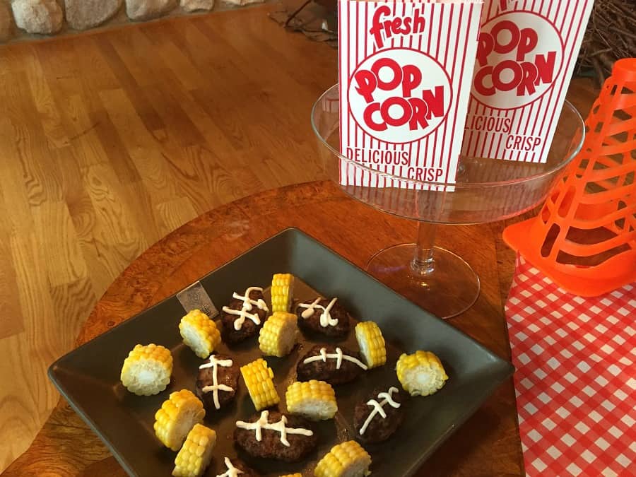 To begin the event, we made meatballs in the shape of footballs and used a squeezable mayonnaise bottle to create football stitching. Sliced corn on the cob made the platter pop and allowed guests to nibble plate-free.The more difficult one is made with a ‘proper’ cream sauce.