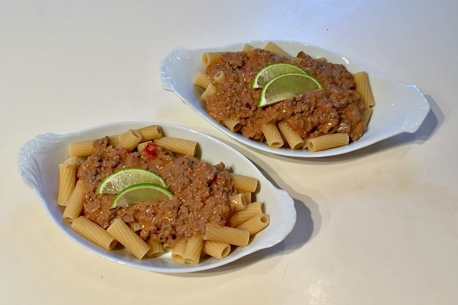 We all love nachos, and they are certainly a staple of football watching. I was curious as to whether a super-simple pasta recipe could replicate the famous taco. I devised a plan, and this one is a real winner. Using store-bought ingredients you pretty much dump them all in as you salivate. The rigatoni is hearty and masculine, and this recipe is also easily be made ahead of time and put in individual lasagna dishes for baking to serve at halftime.